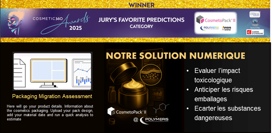We are proud to announce that CosmetoPack®II has been awarded for the Jury's favorite PREDICTIONS category. This recognition encourages us to deepen our knowledge in the scientific understanding of container/content interactions to provide the profession with an effective digital solution in the near future.